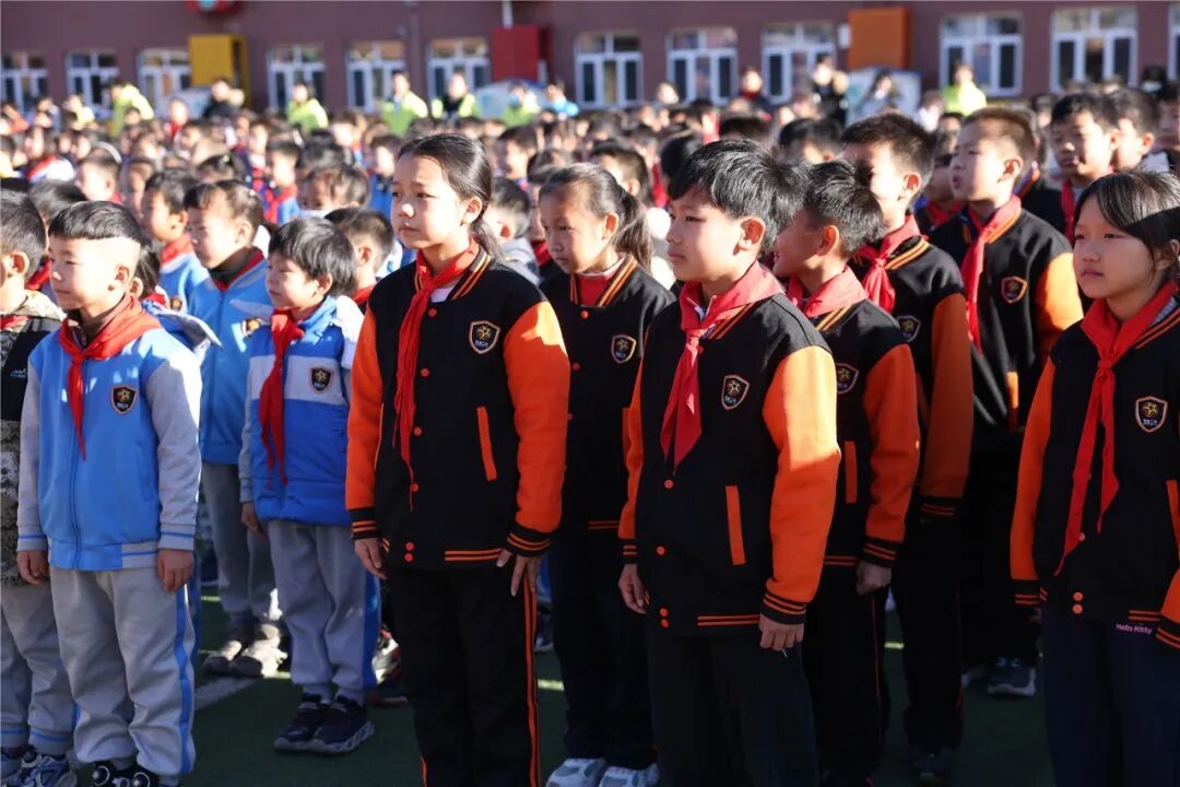 升旗仪式上,伴随着雄壮的国歌声,五星红旗冉冉升起,全体师生肃立敬礼,爱国情怀在每个人心中深深扎根。