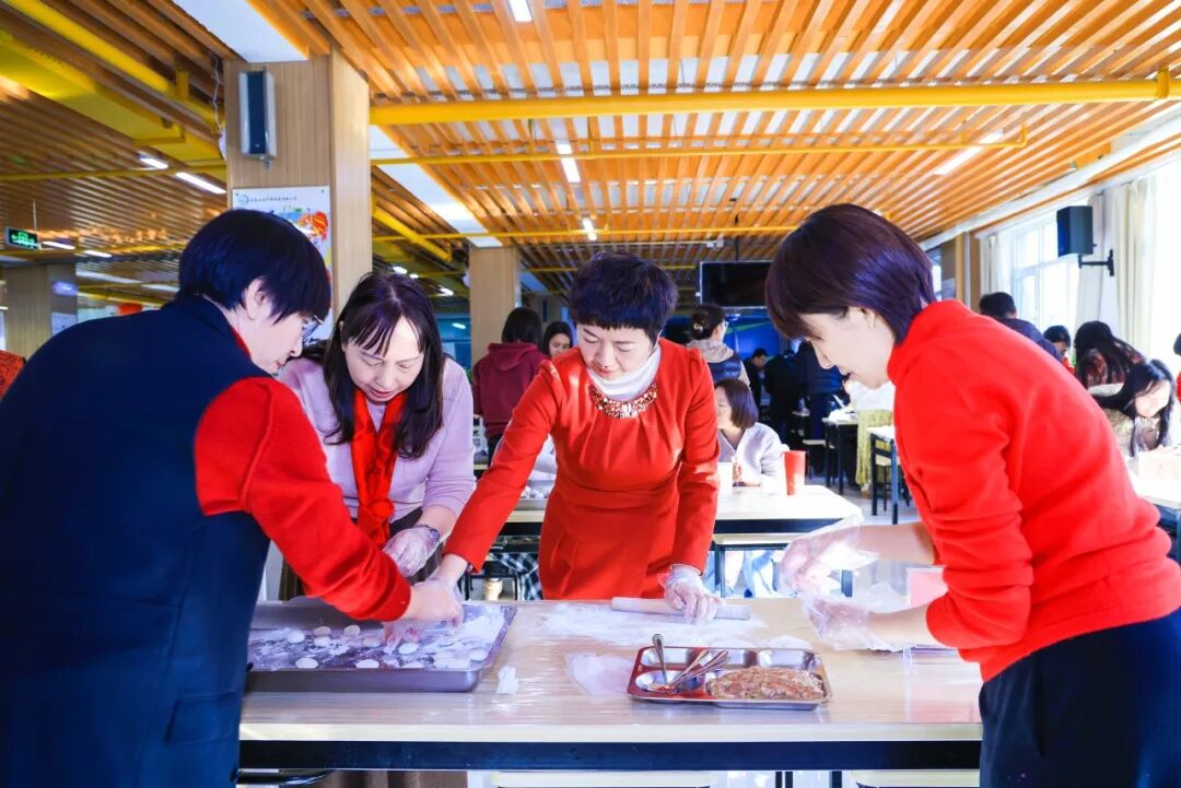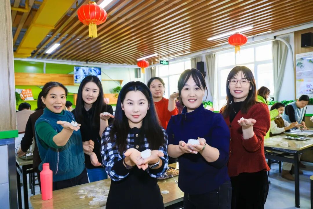 学校餐厅内暖意融融。老师们挽起袖子、分工协作,和面、擀皮、包馅,动作娴熟又充满趣味。一个个形态各异的饺子错落排列,一颗颗圆滚滚的元宵整齐码放,在欢声笑语中逐渐成型。空气中弥漫着面粉的清甜与新年的喜悦,温馨的氛围在餐厅里缓缓流淌。
