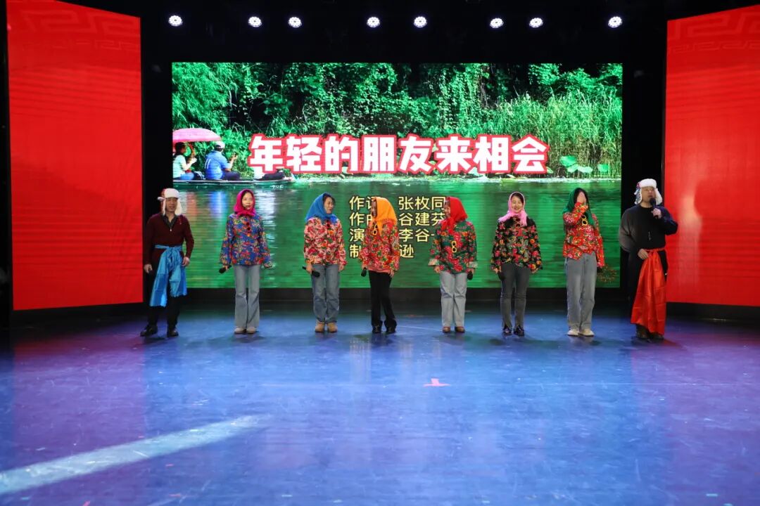 展演2组的歌舞《年轻的朋友来相会》带领大家重温青春旋律,不改的教育初心在歌声中熠熠生辉。