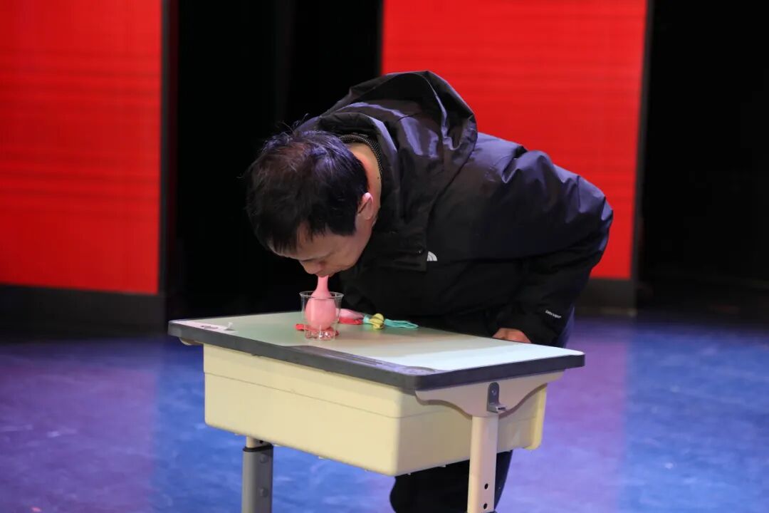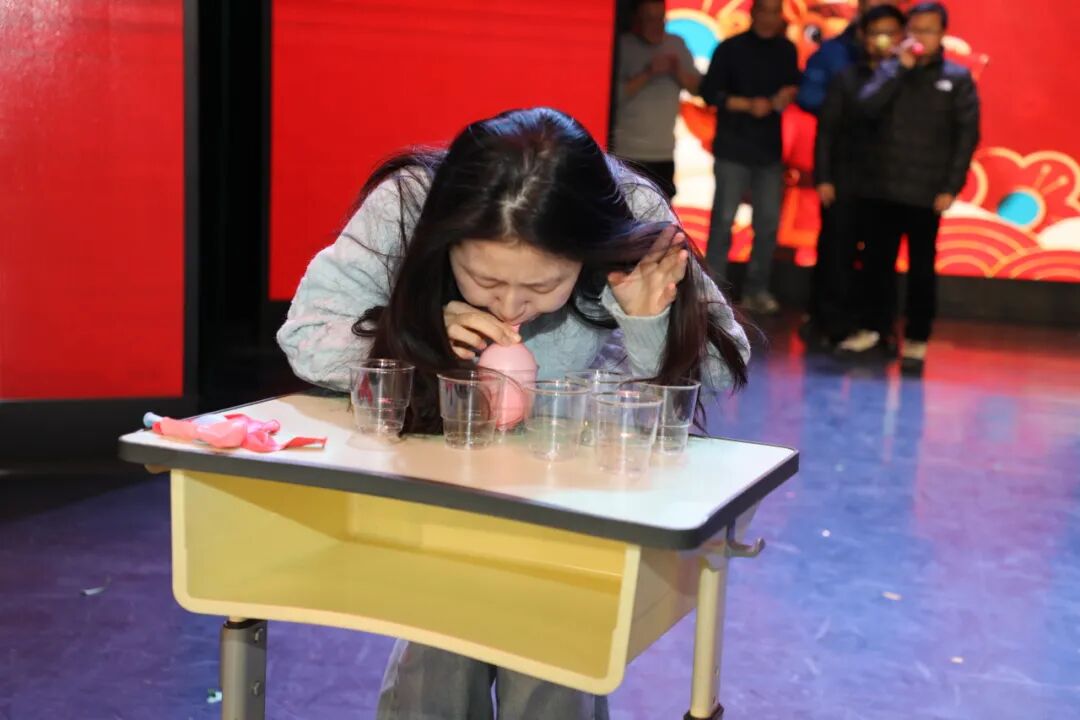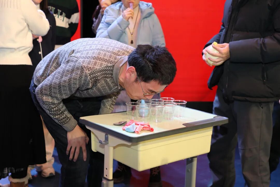 三场精彩的表演后,老师们开始了中场游戏“气球吸纸杯”,各组老师通力协作,吹气球、运纸杯,赛场上的专注与偶尔的手忙脚乱引来欢声一片,充分考验了团队的默契与速度。