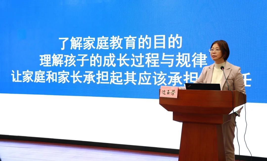 边玉芳围绕2022年1月1日实施的《中华人民共和国家庭教育促进法》中的具体内容,从了解家庭教育的目的、理解孩子的成长过程与规律、让家庭和家长承担起其应该承担的责任等方面,帮助家长认识到家庭教育中要经常关注孩子的心理变化,提醒家长应该与孩子多沟通交流,及时发现成长过程中的孩子遇到的困惑,通过疏通引导,做孩子成长路上的引路人。