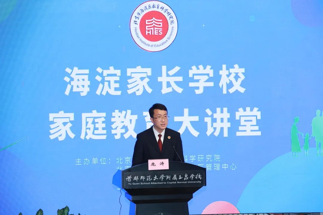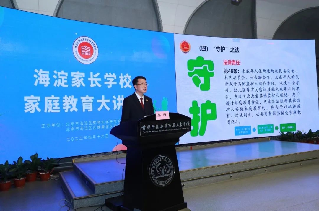 4月16日,海淀家长学校·家庭教育大讲堂,特别邀请了北京市人民检察院第一分院第七检察部(未成年人检察部)副主任、三级高级检察官庞涛主讲第十二课,讲座的主题为“关键词”里的《家庭教育促进法》。