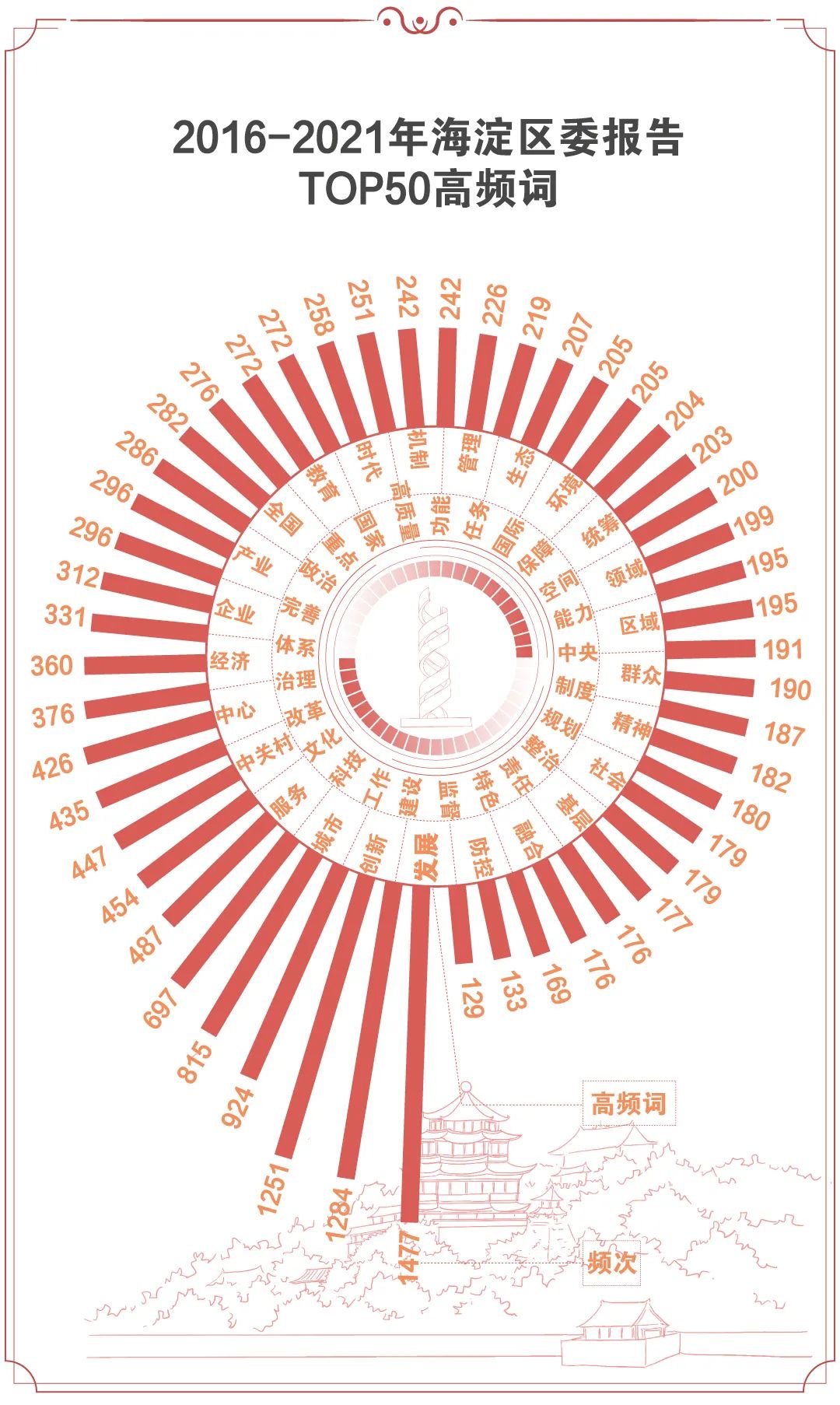 在过去五年里,海淀的工作重点主要集中在“发展”“建设”“创新”等方面,其中,“发展”出现频次最高,是海淀近年来工作重心。