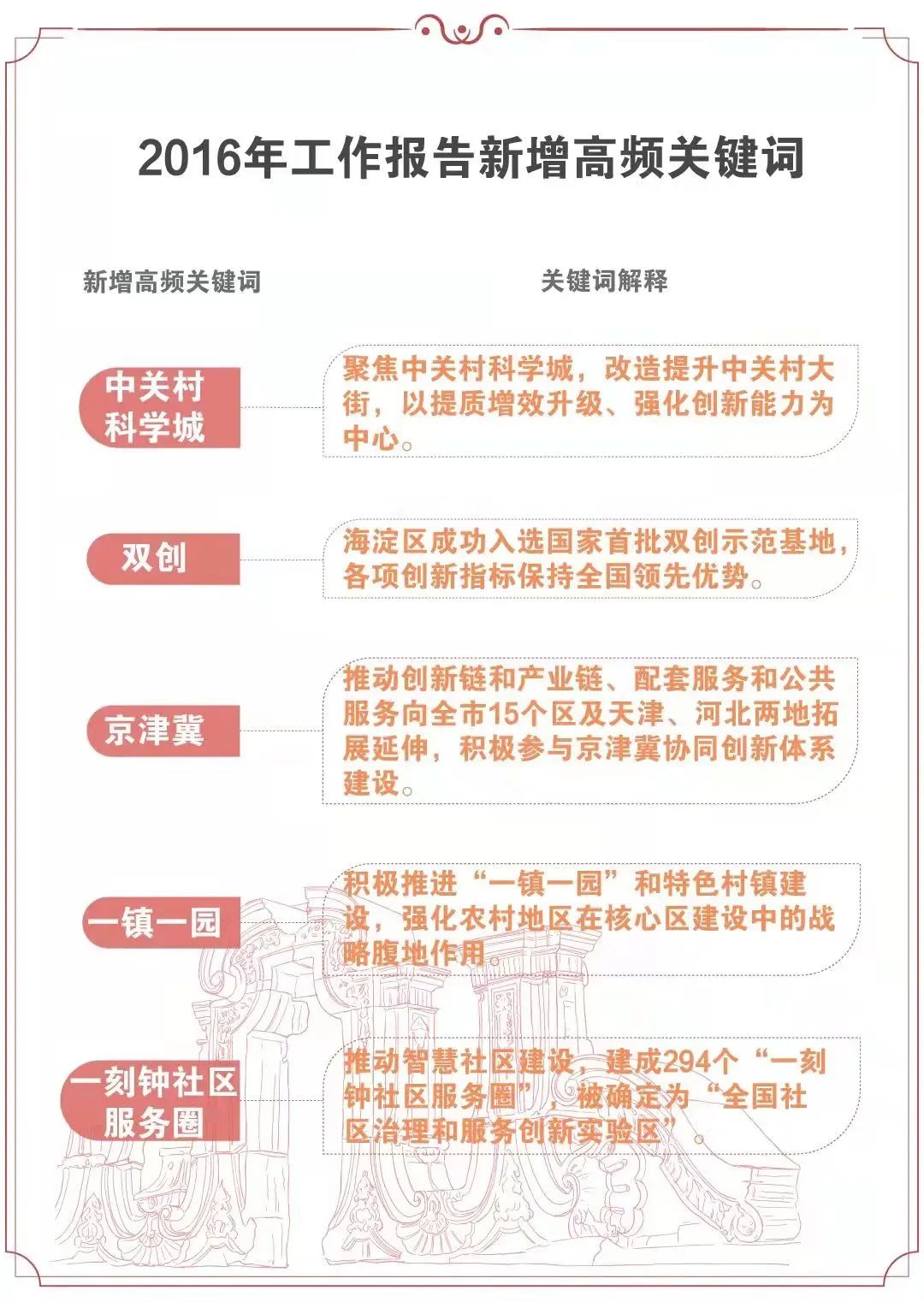 在对历年报告文本进行分析时,我们也发现了这些新增高频词,它们在一定的时期出现,显示了海淀新阶段的发展重点。