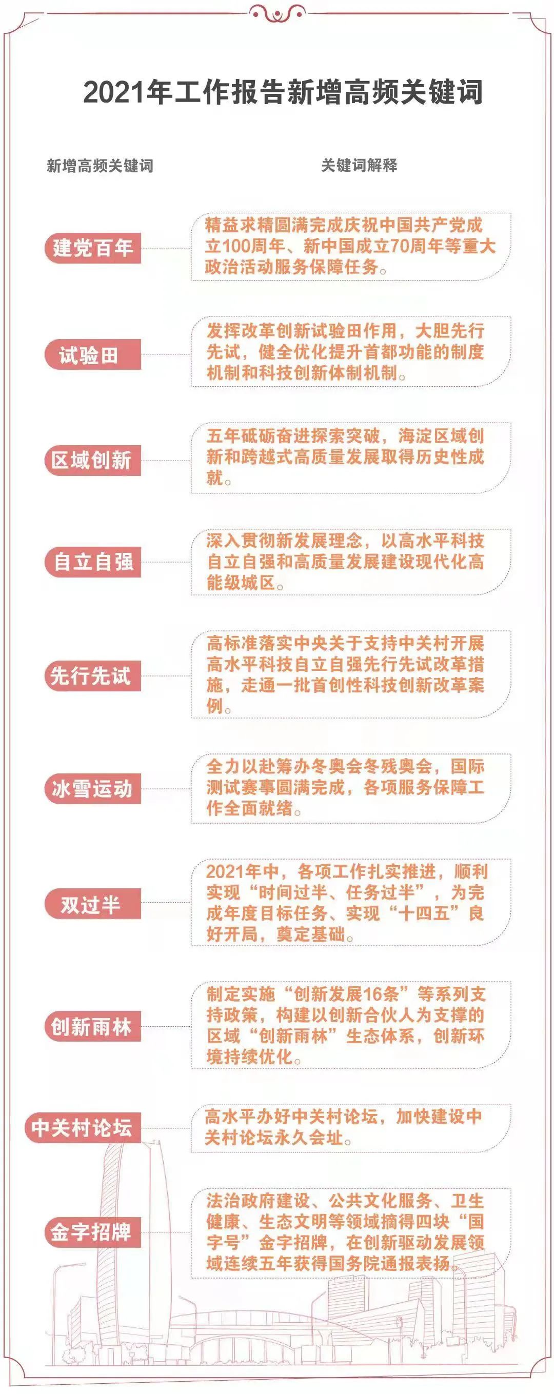 2021年是中国共产党成立100周年,是“十四五”开局之年,是我们党第二个百年奋斗征程全面启程之年,是我国现代化建设进程中具有特殊重要性的一年,是海淀服务融入新发展格局、建设北京国际科技创新中心核心区的关键之年。除了“发展”“创新”,“试验田”“区域创新”“高质量”等词汇也体现着这一时期海淀区现代化国际化创新型宜居宜业城区和北京国际科技创新中心核心区建设新征程。