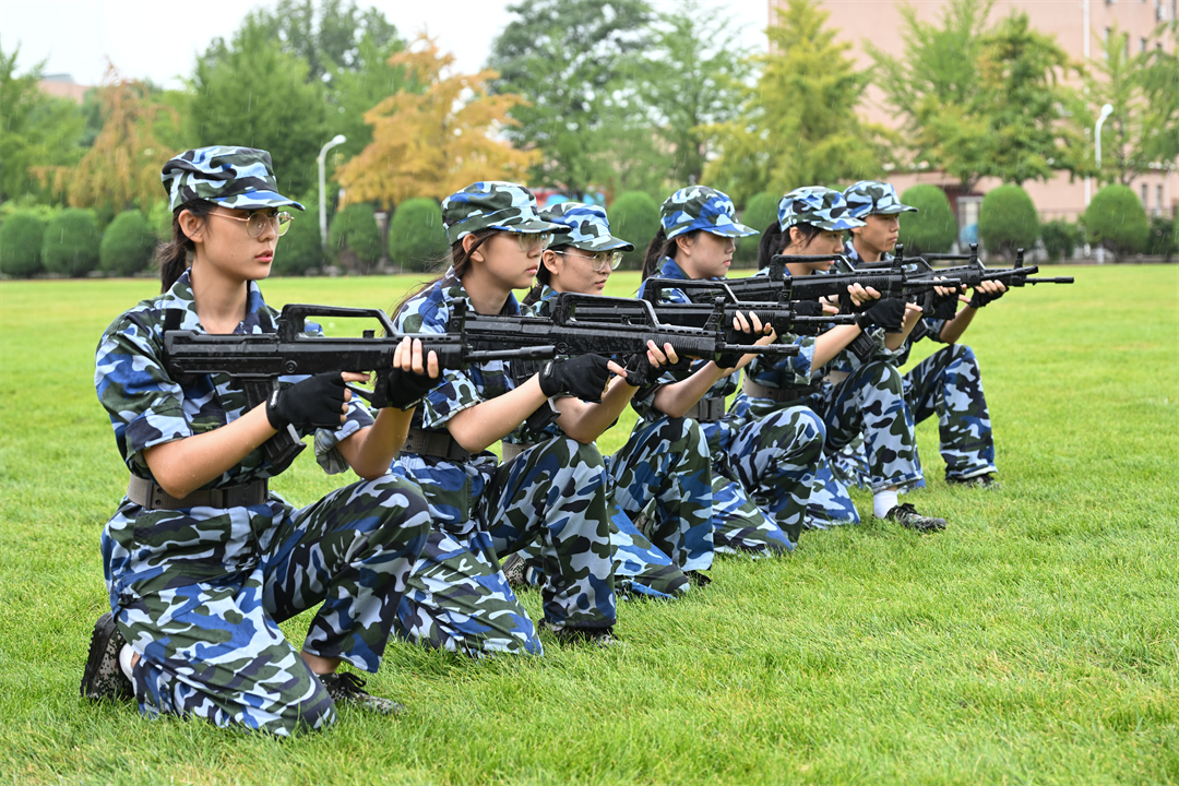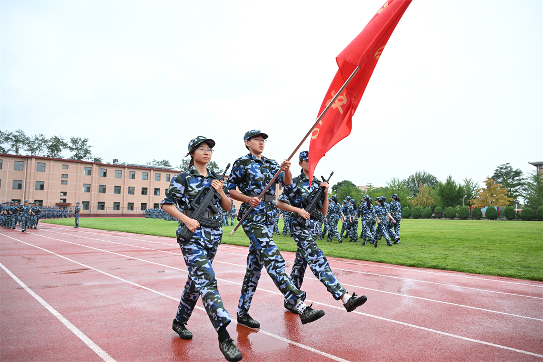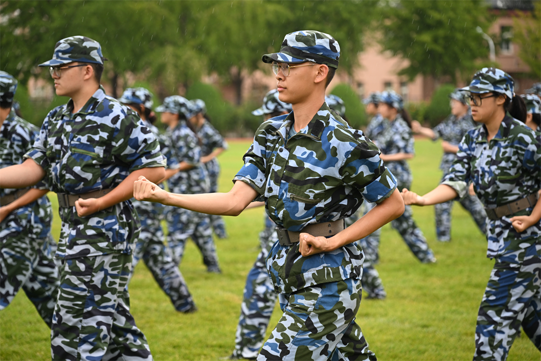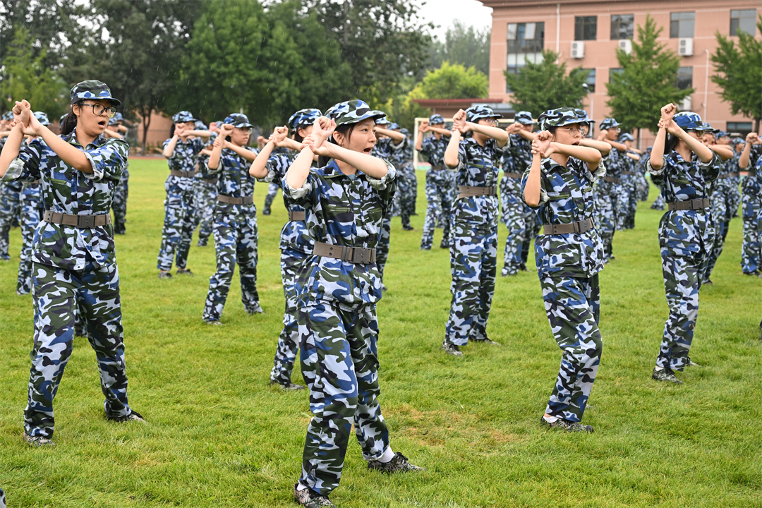 军训汇演中没有一位同学因为淋雨就想逃避和退缩,而是全部坚持到了汇演最后,在场的所有人也坚持到最后,同心协力,完成军训汇演任务。