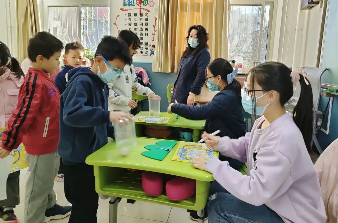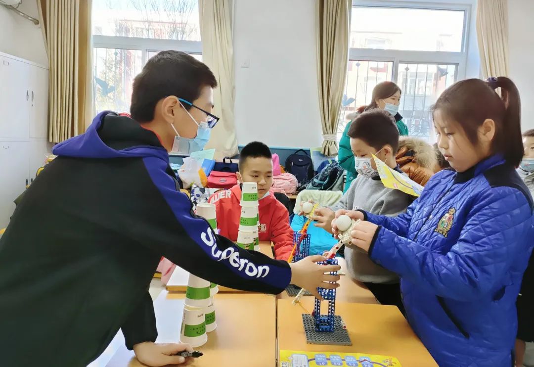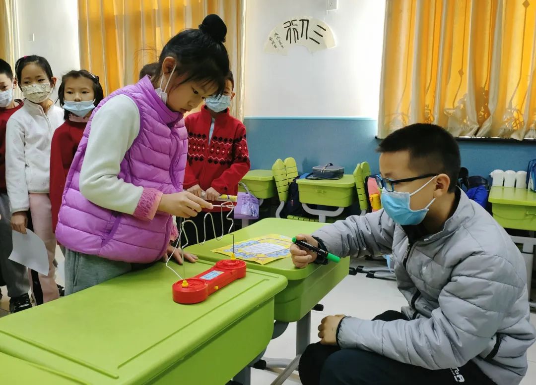 二十多名高年级学生作为志愿者耐心细致地引导小同学动手实践,训练他们解决问题的思考力与判断力。