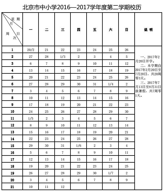 现将2016—2017学年度北京市各级各类学校校历列出,请结合本地区、本学校实际情况执行。