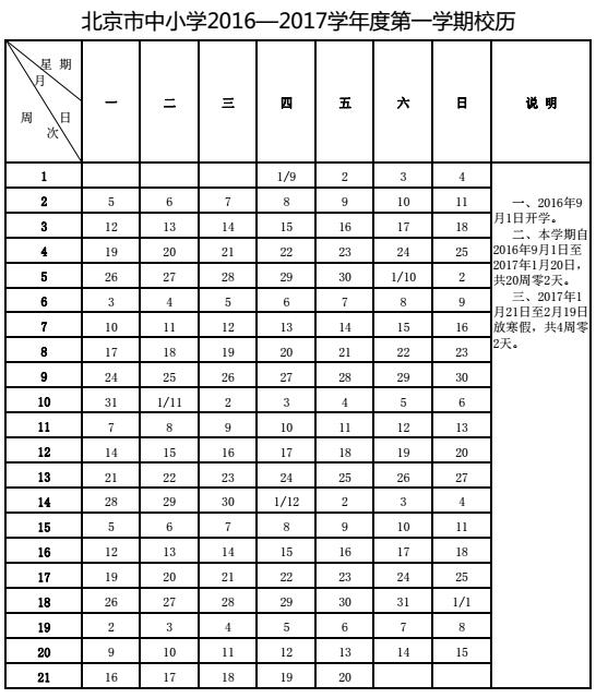 2016年9月1日(星期四)至2016年12月20日(星期二)活动15周零6天;2016年12月21日(星期三)至2017年1月3日(星期二)放寒假2周。