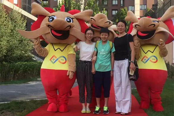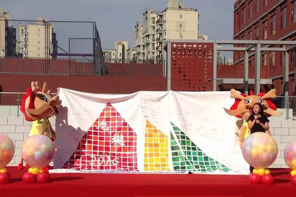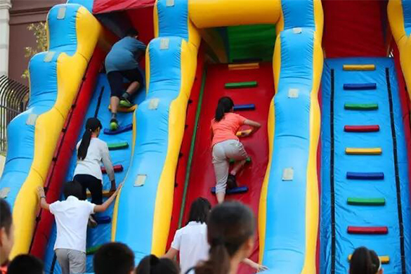 踏过红毯,家长在这儿将孩子亲手送上一只高5米,长18米的气模滑道的滑梯口,孩子独立的爬到滑道顶端,并从另一端滑下,老师亲手迎接。这象征孩子们告别了小学,离开了完全由父母照顾和引领的童年时代,自主地开始了初中生活。