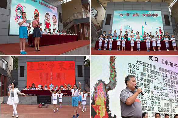 为进一步培养学生养成良好的生活和学习习惯,加强学生道德行为规范,传承中华民族传统美德,学校把新学年开学典礼的主题定为“与守则同行 做有德少年”,旨在围绕“学习落实新《守则》”;通过学生喜闻乐见的形式,引导学生树立正确的言行导向;从而让《新守则》真正内化于心,外化于行,全方位地作用于学生良好行为习惯的培养。开学典礼由德育副主任杜文雯带领五(6)班王元珩同学主持。整个活动以“七一号”启航为主线,回顾过往,我们乘坐着这艘“七一号”在船长张建芬校长的带领下奋勇前行在浩瀚的大海中,快乐地驶向梦想的彼岸;在“七一号”启航——欢迎新水手中,我们又迎来了417名天真可爱的一年级小同学们,少先队员代表向417名新生赠送了崭新的文明礼仪“口袋书”,为他们开启了小学生活最美好的第一章;“七一号”启航——在传承和发扬中扬帆,将继续传承和发扬中华民族传统文化,曲艺社团和京剧社团的学生代表用崇高的队礼来表达对艺术家的感激之情,以传统的力量来凝聚知礼爱学的信念:首先由京剧社团的学员代表行“谢师礼”,而后几位同学向大家展示了《拾玉镯》中几个简单的基本动作,著名京剧表演艺术家张丽雯老师在讲话中希望有更多的同学能领略京剧丰富深邃的文化内涵,尽情享受民族传统文化的魅力;曲艺社团的学员代表——在深鞠一躬后,把曲艺基本功“贯口”向全校师生进行了展示,著名相声表演艺术家赵炎老师在观看后的讲话中希望有更多的同学了解相声艺术并喜欢上相声,让传统艺术之花在校园中绽放;在“七一号”启航——整装待发环节中,我们首先回顾了以往在践行小学生守则中成长的足迹,而后请同学们通过勾画五角星自我评价的方式一起寻找新的航标灯,敦促孩子们在新的航程中人人争做拥有50颗星的“美德少年”;最后在“七一号”启航——船长的嘱托中,我们的“船长”——张建芬校长在起航前为师生送上新学期的嘱托,她指出:过去的一年里全校师生乘坐“七一号”齐心协力摆舵扬帆、奋勇拼搏,在教育教学等方面取得了可喜的成绩,新学期开启新的梦想,出发前提议同学们:树立一个信心——我能我行;创立一种学风——勤学会学;培养一个习惯——自觉自愿;创设一个环境——文明有序;师生一起努力,带着自己的梦想用勤劳和智慧乘风破浪、扬帆启航,共同驶向理想的彼岸,共同铸就七一小学新的辉煌。海淀区区委常委、区纪委书记芦育珠代表莅临领导讲话,她首先对近年来学校在办学特色及教育、教学方面所取得的成绩表示祝贺;接着在第32个教师节即将到来之际向全体教师表达节日的问候;更在长征胜利第80周年的日子里希望全体学生在新学期继承和发扬长征精神,共擎先辈的旗帜,取得更喜人的成绩。
