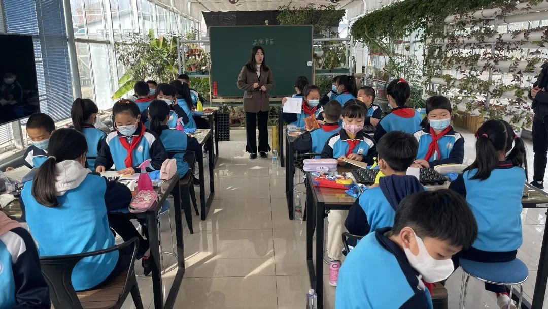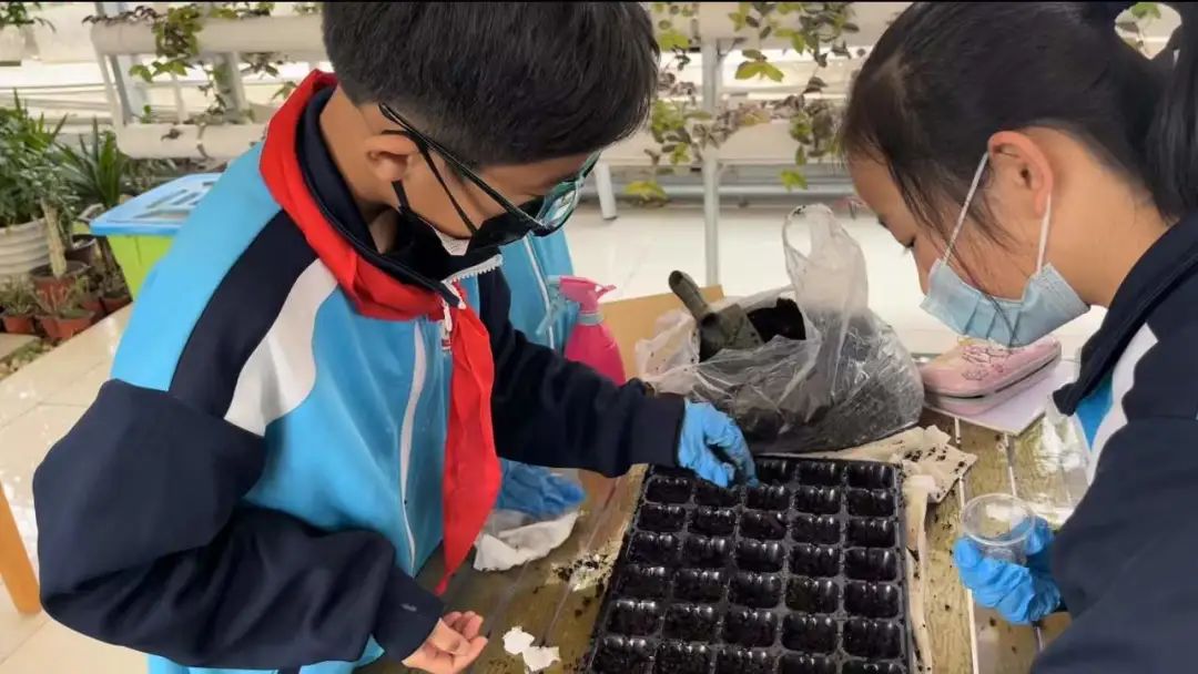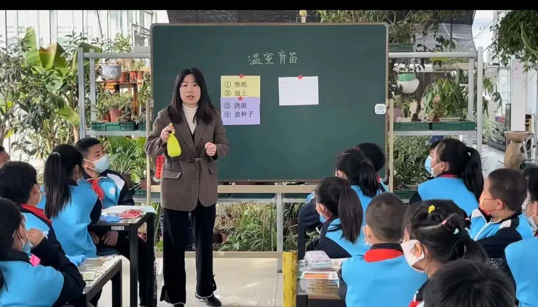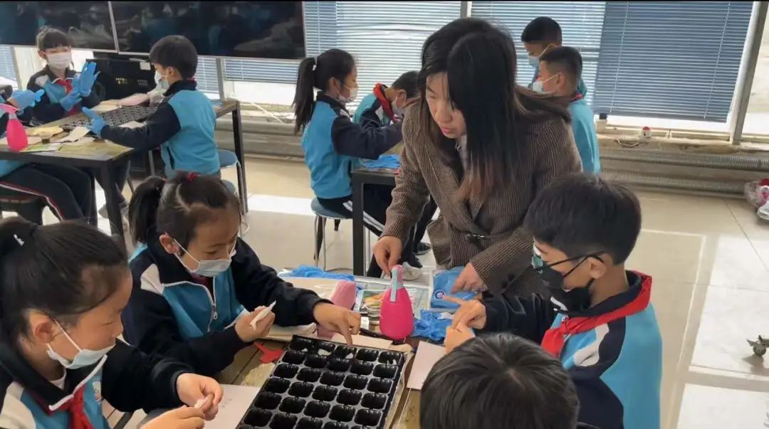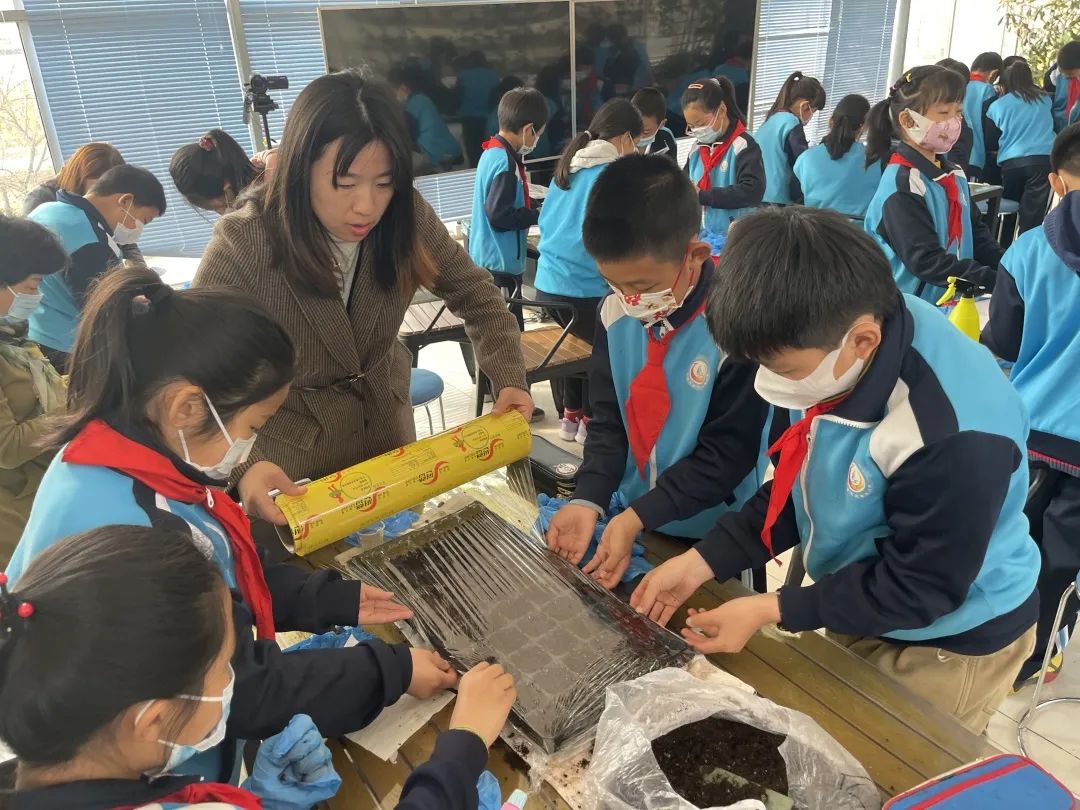 为了保证按时播种,张赛楠老师带着四年级的孩子们尝试利用校内温室大棚开展科学育苗实践活动。