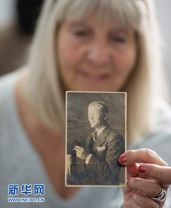 2014年4月28日,“中国之友”辛德贝格亲属参观“江南水泥厂难民营”旧址 ,外甥女玛丽安娜在展示辛德贝格的肖像照片。 新华社记者 李响 摄