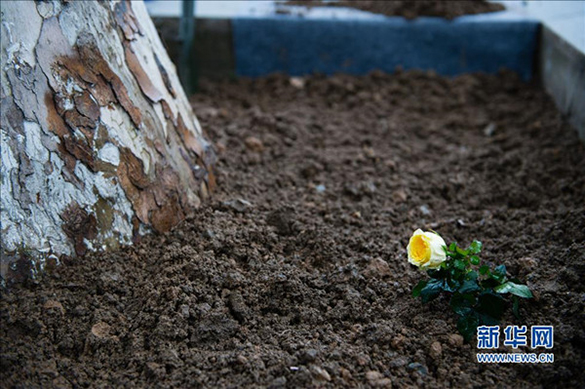 2014年4月27日,丹麦女王玛格丽特二世在南京参观侵华日军南京大屠杀遇难同胞纪念馆。这是玛格丽特二世在和平树下插下的“永远的南京·辛德贝格黄玫瑰”。 新华社记者李响摄
