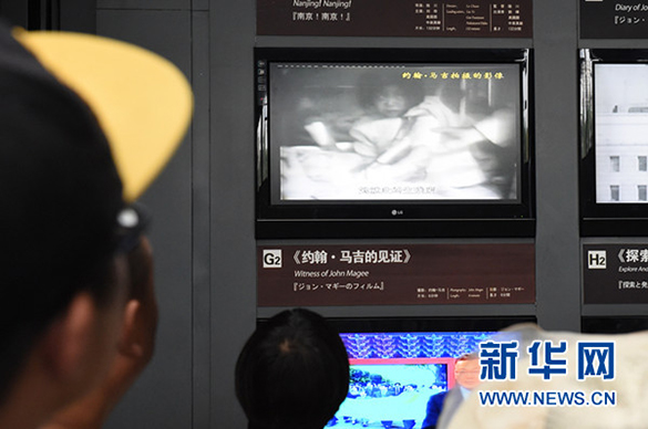 2015年10月3日,观众在侵华日军南京大屠杀遇难同胞纪念馆观看当年南京安全区国际委员会委员、国际红十字会南京委员会主席、美国牧师约翰·马吉拍摄的记录南京大屠杀真相的电影影像。新华社记者 孙参 摄