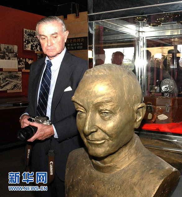 2002年10月2日,美国牧师约翰·马吉拍摄日军南京大屠杀暴行摄影机捐赠仪式在侵华日军南京大屠杀遇难同胞纪念馆举行,约翰·马吉的儿子大卫·马吉在纪念馆陈列的父亲头像前驻足。新华社记者杨磊摄