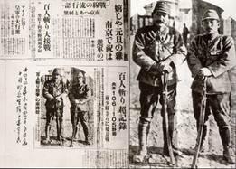 图为1937年12月14日日本《东京日日新闻》刊登关于野田毅、向井敏明杀人比赛的报道。此时,向井敏明已杀了一百零六人,野田毅已杀了一百零五人,但无法判定谁先杀满一百人,故相约以杀一百五十人为目标,继续竞赛。