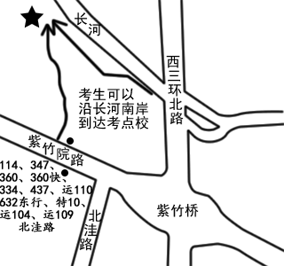 位于紫竹桥西面路北的苏宁电器旁胡同中,进入考点校的道路狭窄且是单行线,汽车无法掉头,接送考生的汽车请在紫竹桥或万寿寺桥路边停车,考生步行进入考点校大约需要 10 分钟左右。