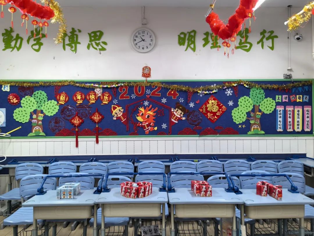 红红灯笼高高挂,张灯结彩“望”新年。贴春联、挂福袋、吹气球、布彩带......老师、学生、家长们齐心协力装扮教室,为校园各处换上最美中国红,表达着对新年万象更新的美好祝愿,“年”味十足!