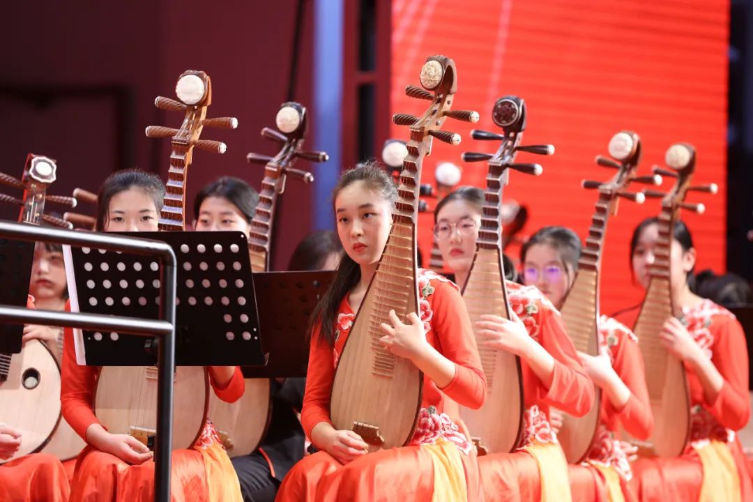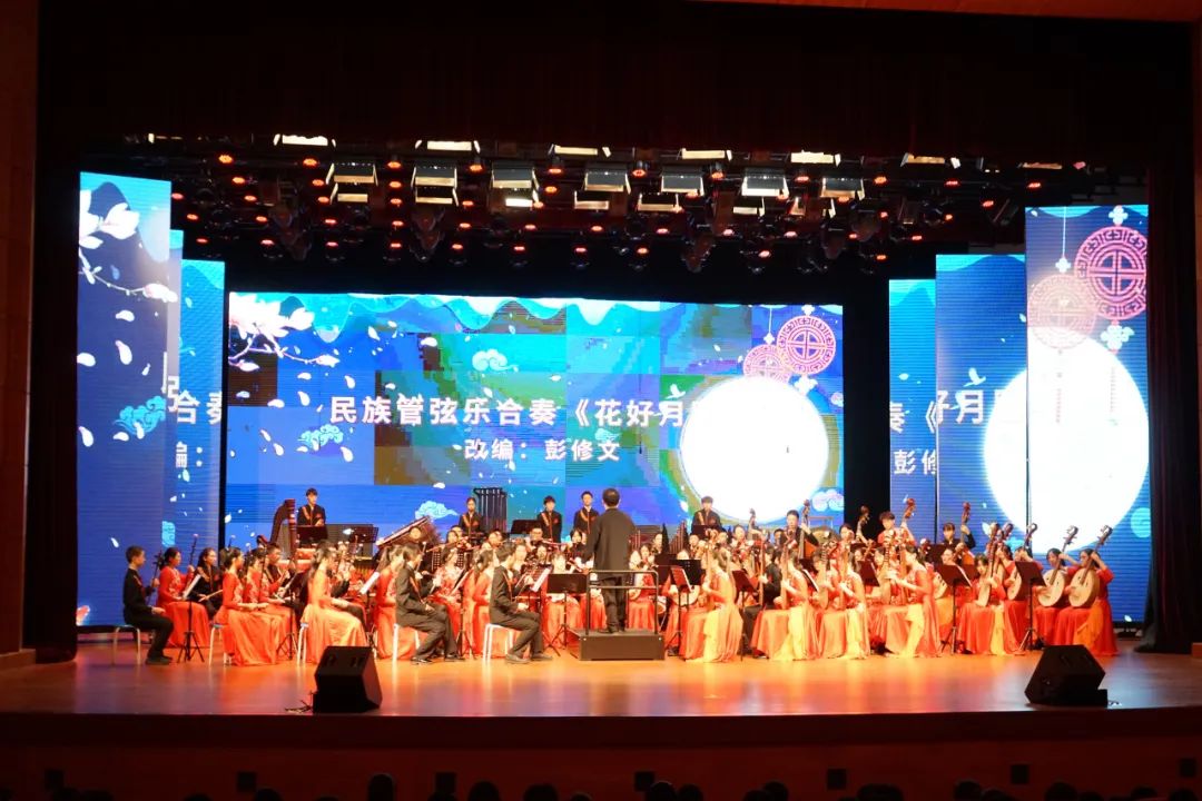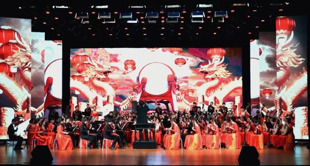 玉兔辞岁,大国腾飞;金龙迎春,民族振兴。民乐悠扬,弘扬优秀传统文化;丝竹悦耳,传播中华美育精神。