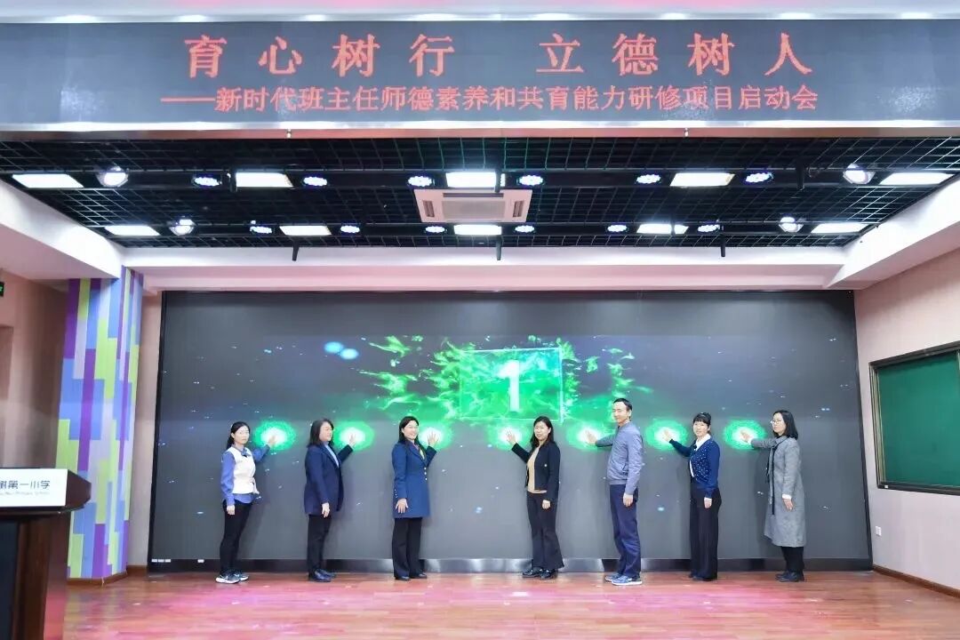 与会领导、来宾、班主任教师代表一同按下启动键,双榆树第一小学“育心树行 立德树人——‘家校社协同提升新时代班主任师德素养和共育能力研修项目’”正式启动。