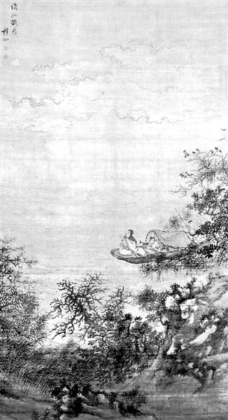 明代画家谢时臣的《谪仙玩月图》,一轮秋月悬挂在画面左上方,画面右下方的小舟上,坐着正举杯对月的“谪仙”李白。