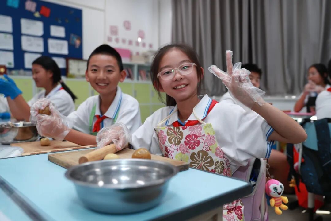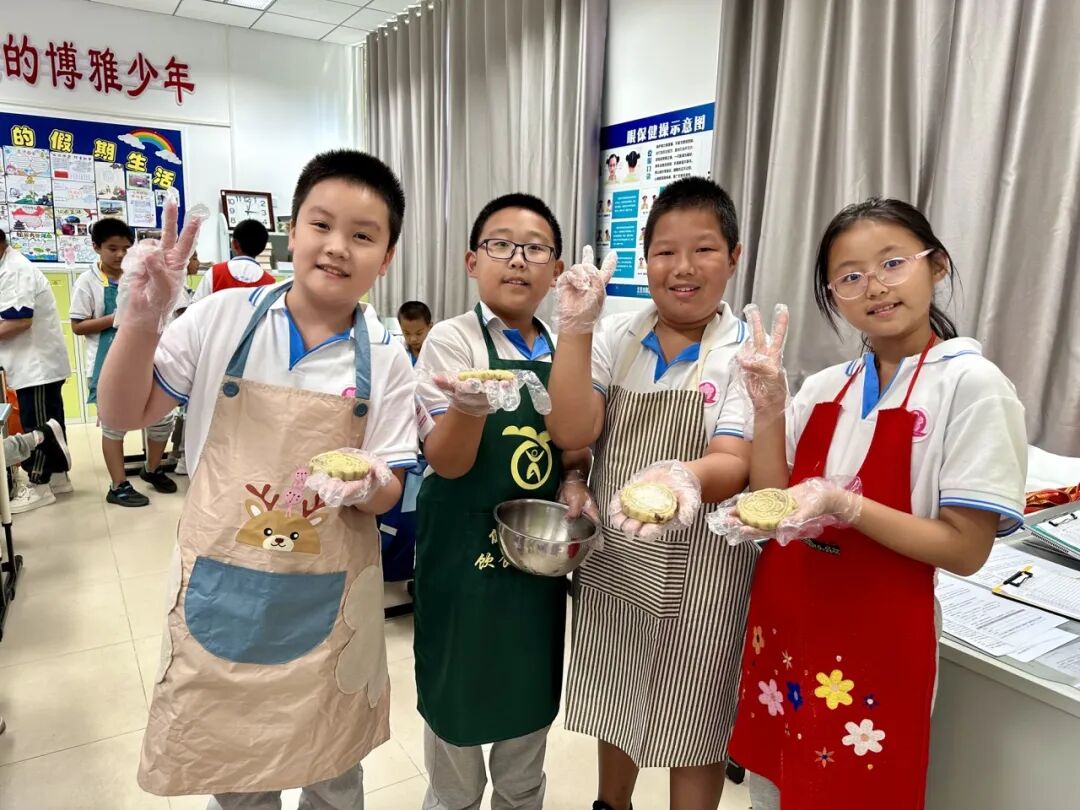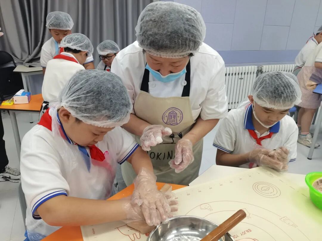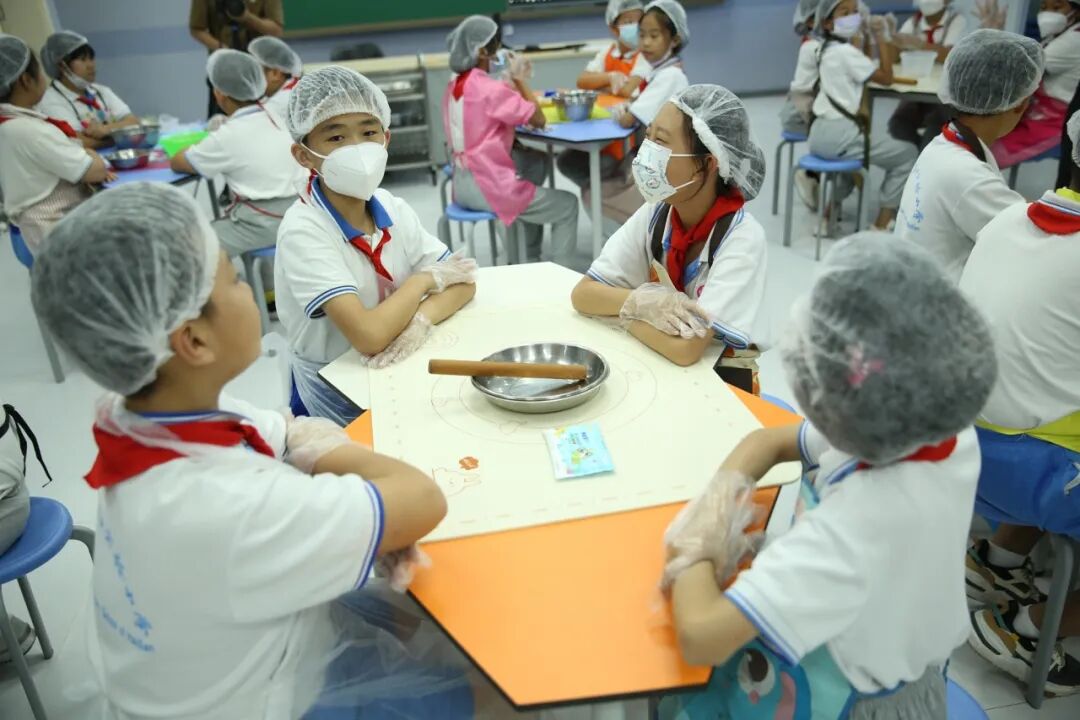 2023年9月22日下午,海淀区第四实验小学的同学们就在学校面点师和老师的指导下,亲手学做了香甜的月饼。