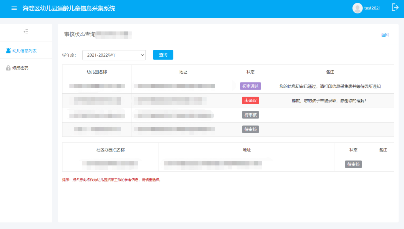 幼儿报名后点击“审核状态查询”按钮,可查看已报名的幼儿园、社区办园点的审核状态,如下图所示: