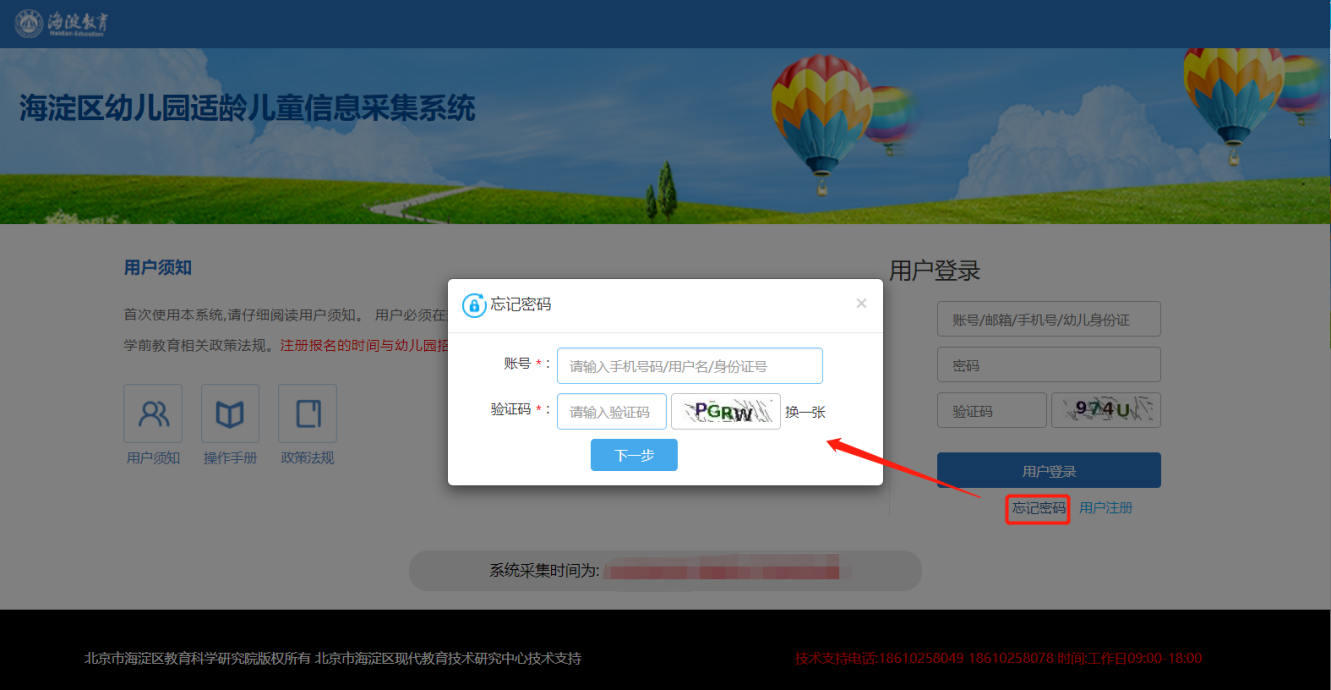 打开海淀区幼儿园适龄儿童信息采集系统,点击“忘记密码”,在“忘记密码”提示框内输入手机号码或用户名、验证码点击【下一步】按钮。如下图所示: